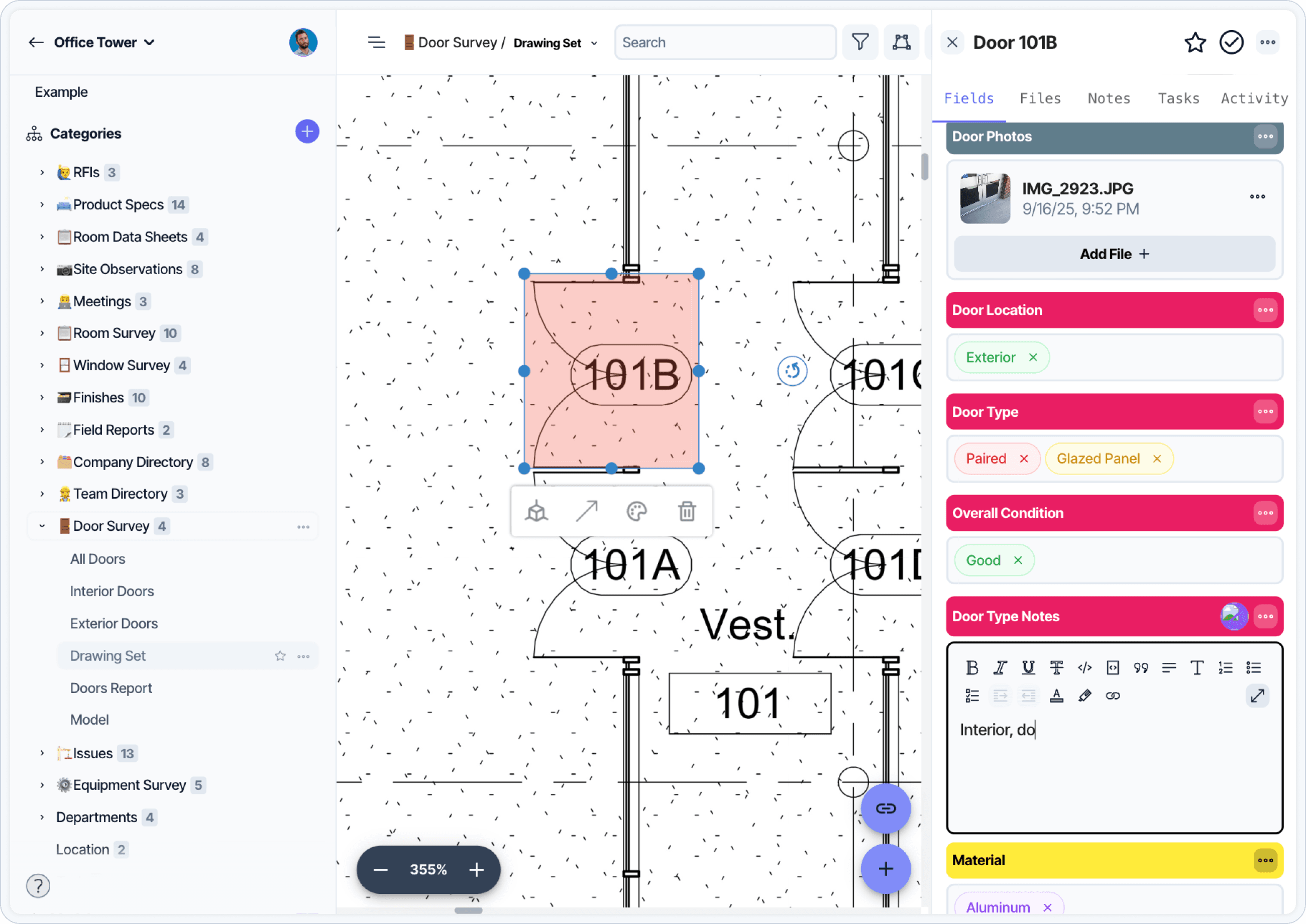 Layer supports a range of data types, including notes, photos, measurements, condition ratings, and photos, all of which can be linked to rooms or elements in your Model. Drawing View makes it easy to organize field data on top of uploaded floor plans. Layer’s Revit Add-in also allows teams to connect that information to Revit models, whether or not a model exists during the site visit.
