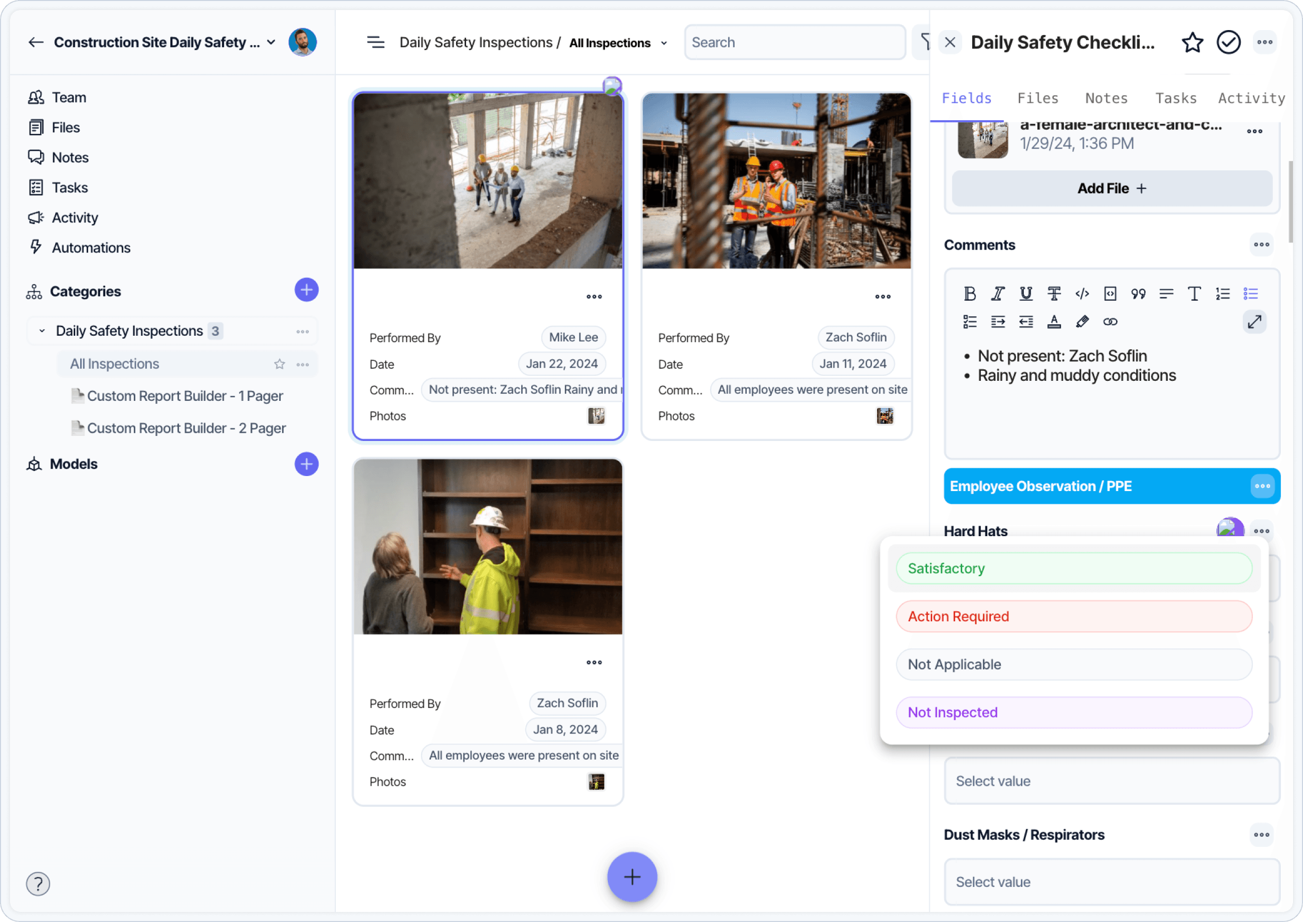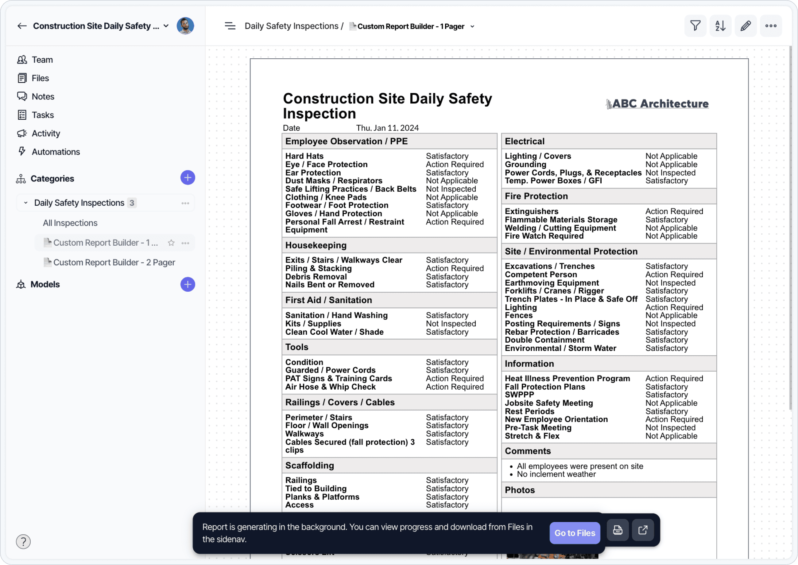 Use a standardized form during every scheduled site visit (you can use Layer’s Daily Safety Inspection Template as a starting point). This makes it easier to create consistent looking reports.