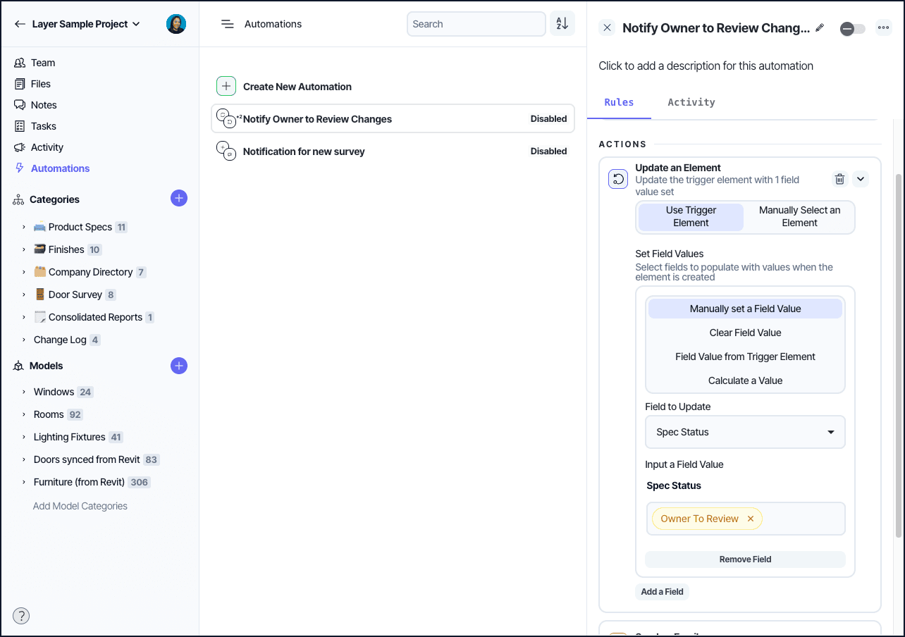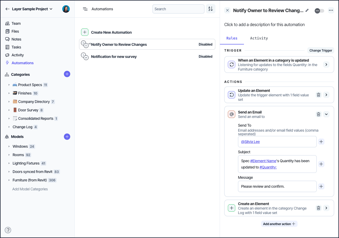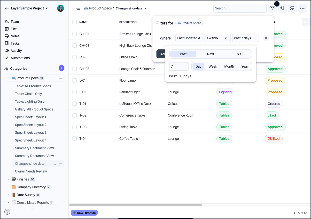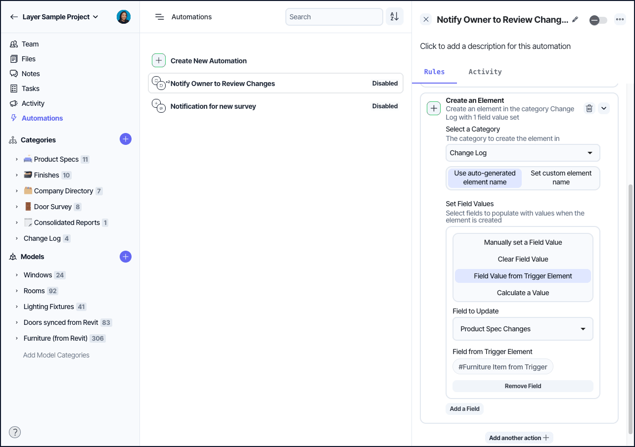 Layer supports multiple ways to track changes to project data. This article explains how to build a workflow that shows what changed, when it changed, and who made the change. Depending on your team or project requirements, you can choose from several approaches with different levels of visibility, notification, and traceability. Changes can be tracked using system metadata, filtered views, custom categories, or automations. These methods can be used on their own or combined into a single workflow.