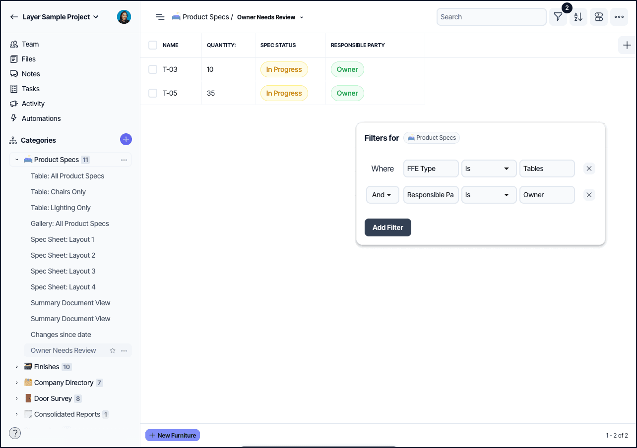Save filtered views to create role-specific dashboards, such as “Owner Review Required” or “Spec Updates for Architect.”