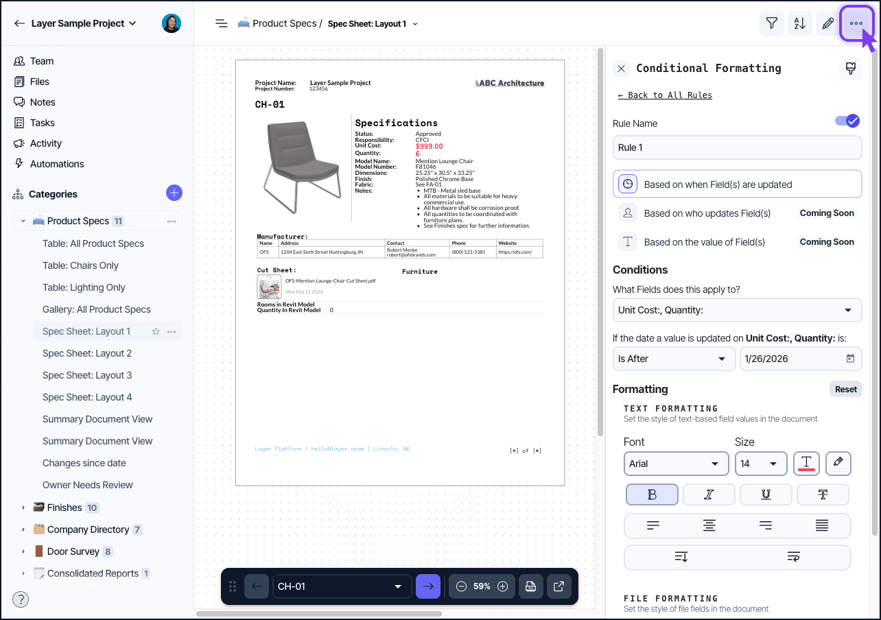 Use conditional formatting to highlight updated values in a document view. Formatting rules are based on system metadata and apply visual styling (e.g. font, color, size) when conditions are met.