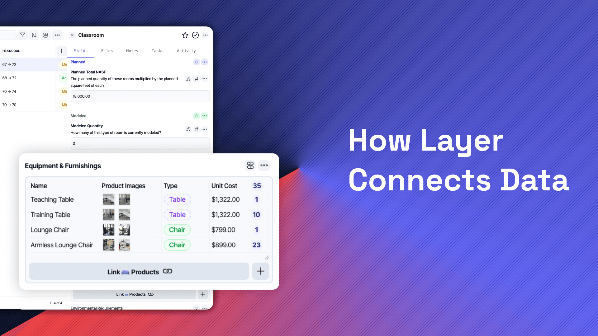 Relationship fields in Layer allow you to connect items across categories, making it easier to manage room data sheets, products, furniture, and model-based elements in one structured system.