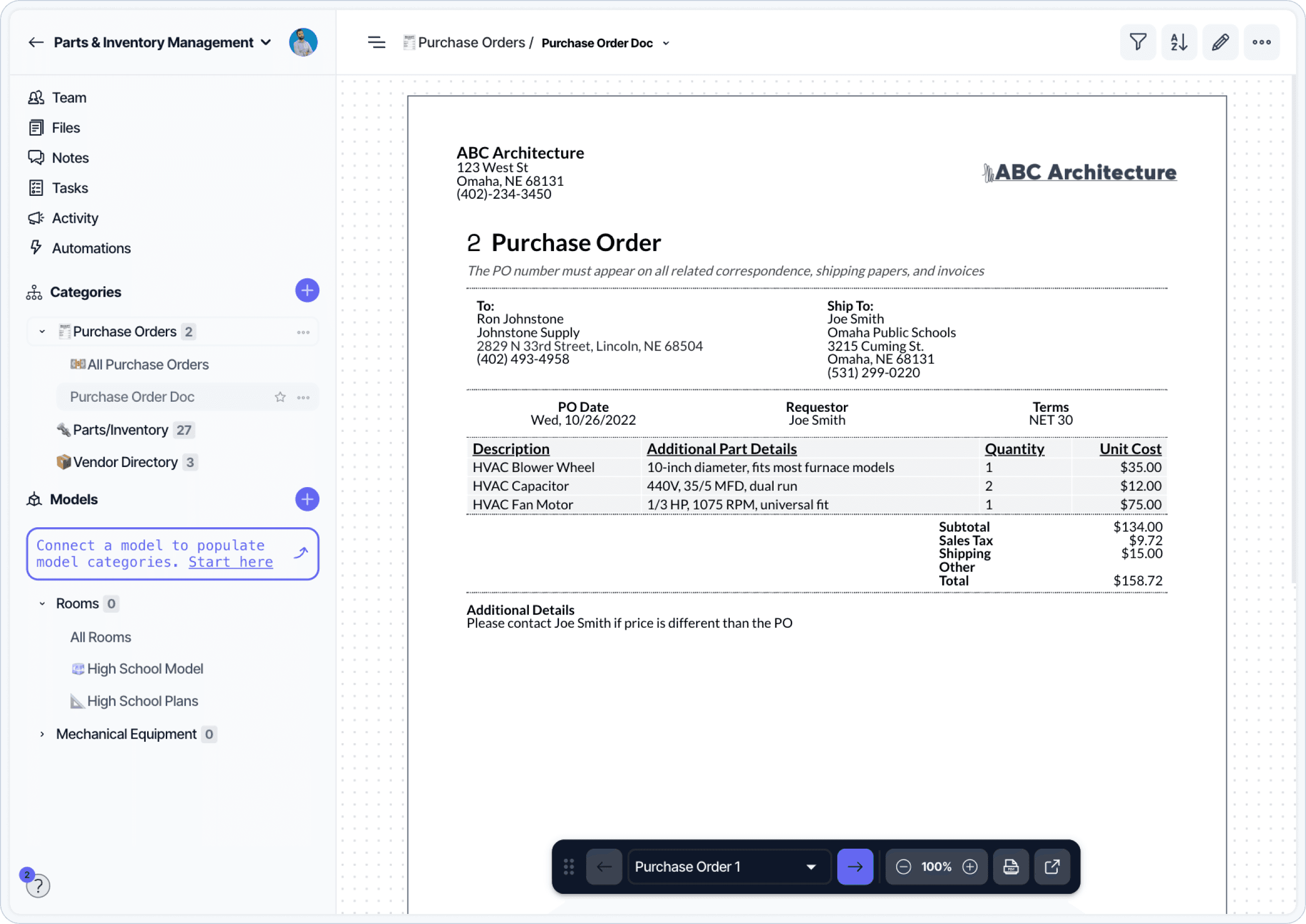 A complete CMMS solution for facilities teams. This template includes work orders, asset management, purchase order tracking, parts/inventory and a vendor directory.