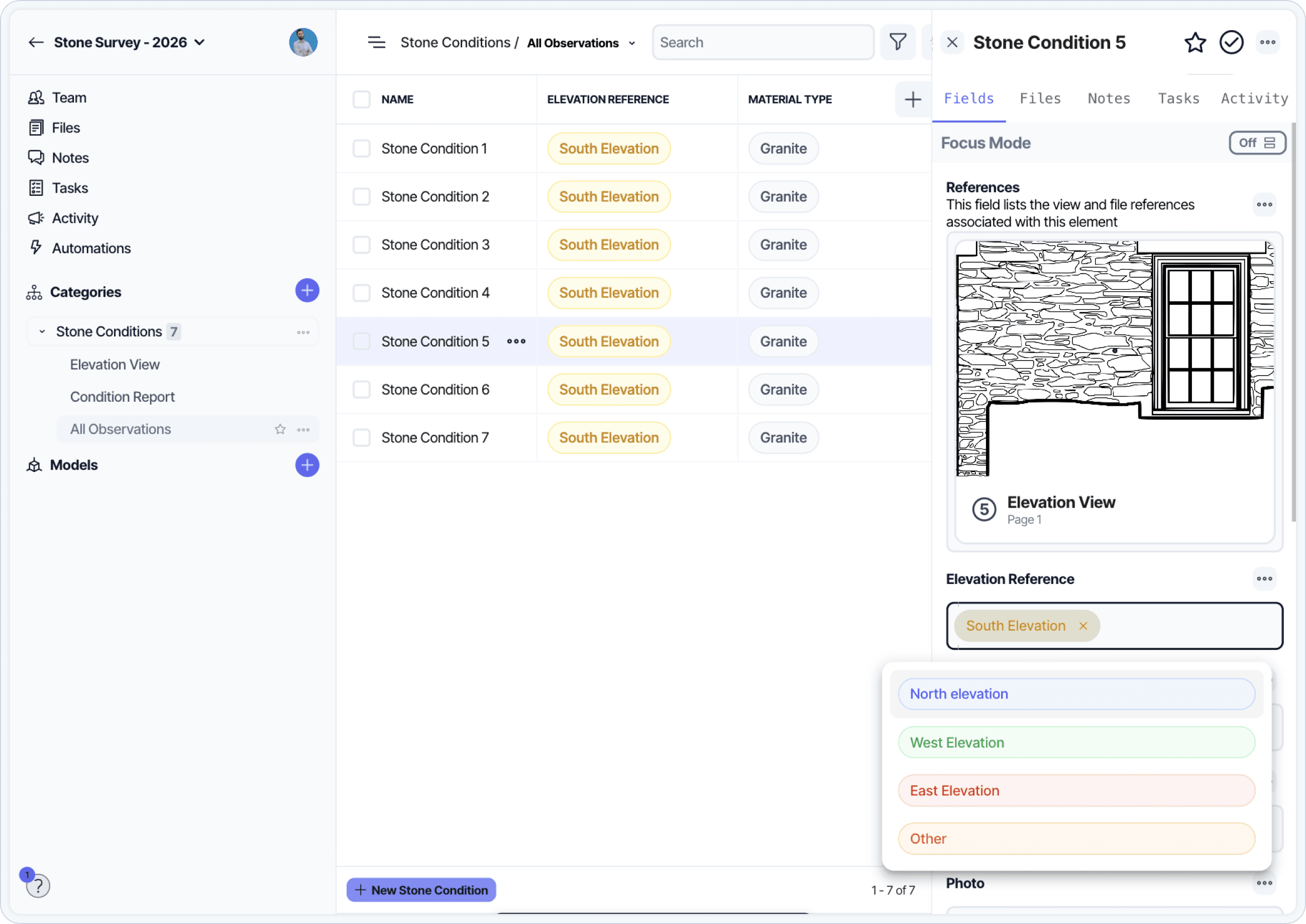 Link each observation to an elevation, floorplan, or Revit model to report with the right level of context for your clients. Then use Layer’s drag-and-drop report builder to export clean masonry condition reports without copying and pasting into separate documents.