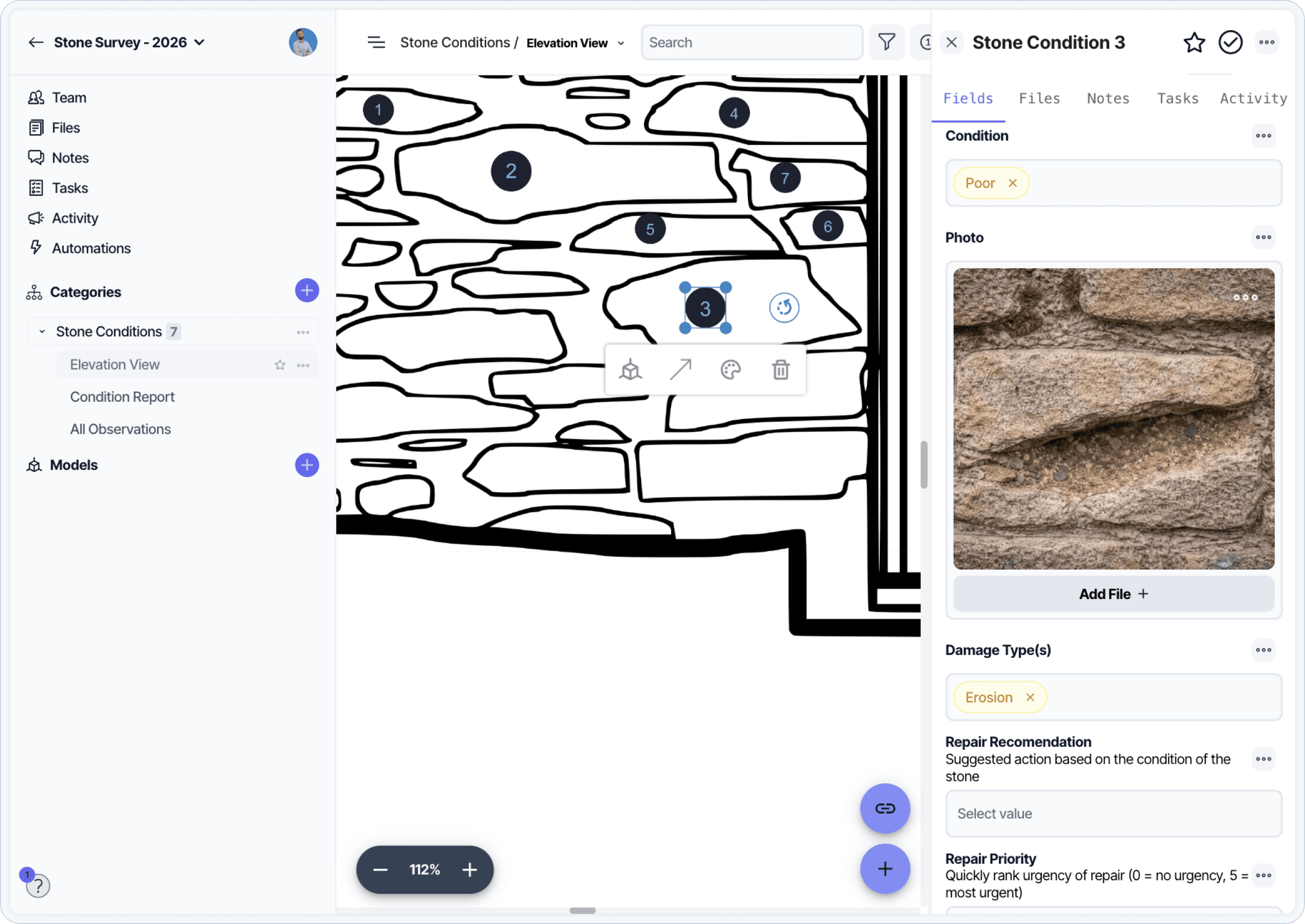 Use 20+ flexible fields to document stone conditions in the field, including material type, condition rating, damage type, severity, photos, and notes.