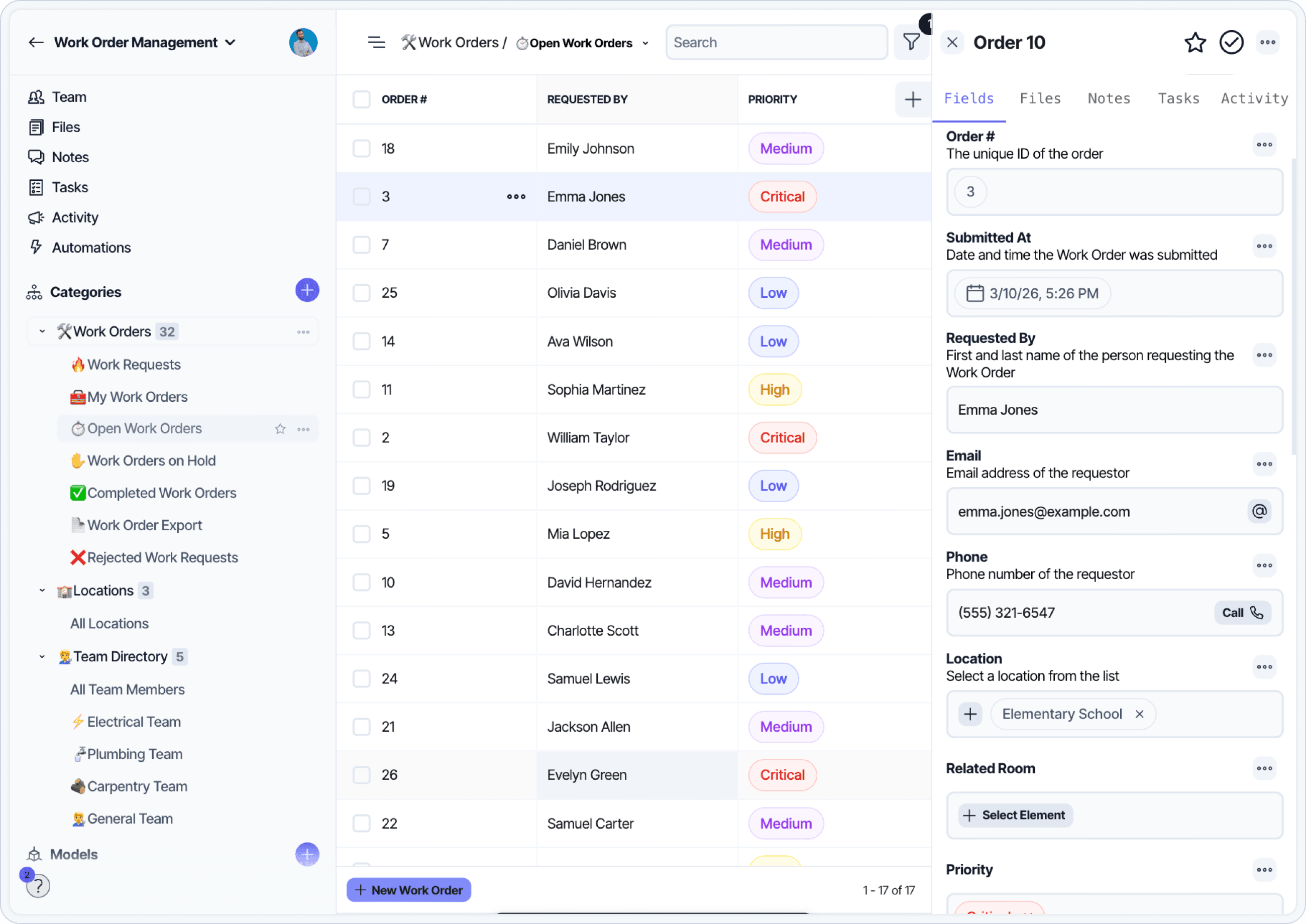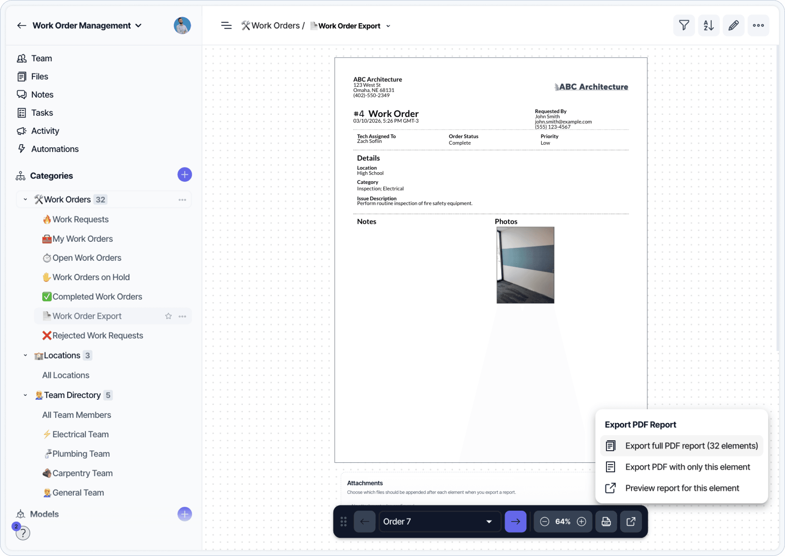Connect work orders to locations, team members, files, notes, and related tasks to improve coordination, reduce response times, and keep everyone aligned.